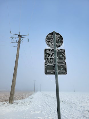 Si même le givre devient belliqueux :le grillage à poule à l’entrée du jardin Marguerite( faut-il le préciser : un espace potager, participatif, collaboratif, collectif )il l’a transformé en barbelé